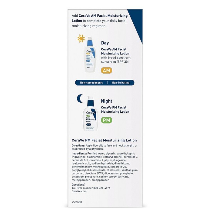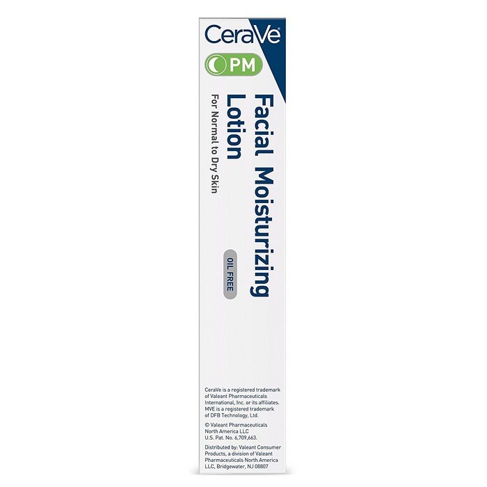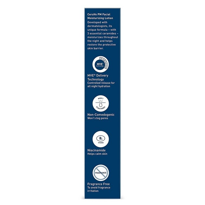 Developed with dermatologists, CeraVe PM facial moisturizing lotion has an ultra lightweight, unique formula that moisturizes throughout the night and helps restore the protective skin barrier with three essential ceramides (1,3,6-II). It features patented MultiVesicular Emulsion (MVE®) controlled-release technology to gradually release the nourishing and protective ingredients into the skin, helping your skin stay hydrated. The formula also contains hyaluronic acid to help retain the skin’s natural moisture and niacinamide to help calm skin.